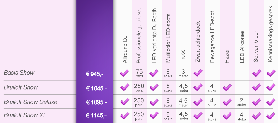 Hierbij in 1 overzicht de prijzen en verschillen tussen de verschillende Bruiloft DJ Shows. Tijdens een kennismakingsgesprek worden deze alle besproken en zoeken we samen naar de beste show voor jullie locatie.